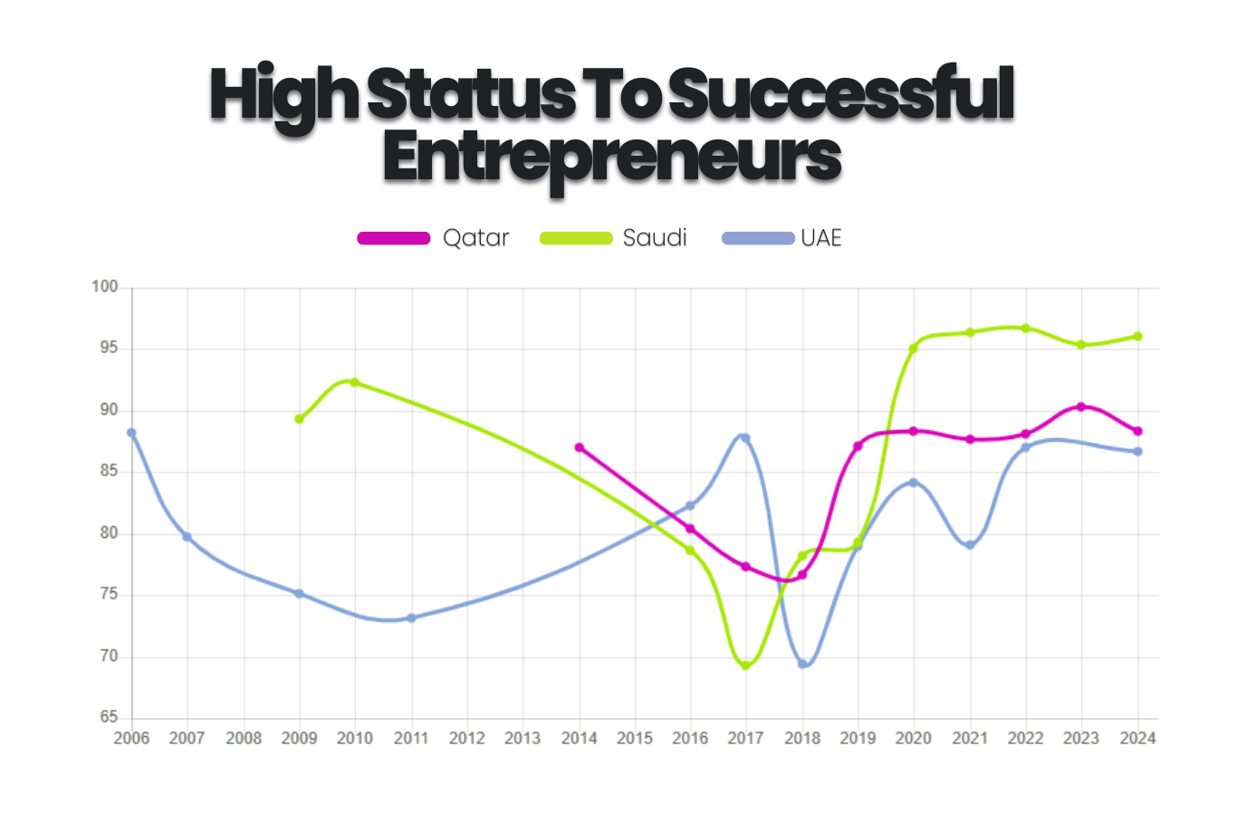 Qatar: More steady climb — status rises, but without the hype bursts. Entrepreneurs are respected, but not necessarily glorified.